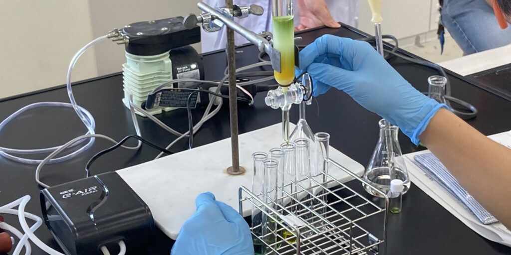 本公開講座は、科研費のひらめき☆ときめきサイエンスの助成を受けて実施したもので、講師の奥野教授から、植物成分の機能性よび機能性成分の探索、分離方法についての講義とそれぞれに対応した実験実習が行われました。植物成分の機能性では、様々な果物ジュースをもちいて、果汁の抗酸化活性についての実験を行いました。また、機能性成分の分離ではワカメエキスに含まれる色素をカラムクロマトグラフィーという手法を用いて分離しました。少し細かい操作もいる実験を参加した小中学生はしっかりと行ってくれていました。