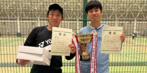 本校学生が和歌山県ソフトテニスインドア選手権大会で優勝 2026年1月19日|イベント 本校 知能機械工学科4年の川端一輝さんが、12月21日(日)に和歌山市つつじが丘屋内テニスコートで開催された「令和7年度 和歌山県ソフトテニスインドア選手権大会」において優勝しました。 本大会は主に社会人選手が集う大会で、全国高等学校体育連盟(高体連)からは、個人戦ベスト16以上の成績を収めた選手に出場資格が与えられており、社会人・高校生併せて50ペアが参加しました。 川端さんは、田辺市の中本さん(TRC所属)とペアを組み、序盤から接戦を制して勝ち進みました。準決勝戦での激闘を制した勢いで、決勝戦も制し、本校生として初の優勝を飾りました。 左から:中本さん、川端さん