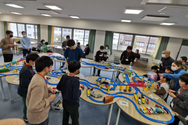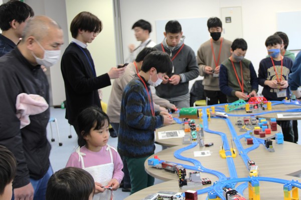 公開講座「プラレール(C)×Micro:bitで学ぶ プログラミングとセンサの仕組み」開催 2024年2月29日|イベント 本校(校長:井上示恩)では、2月17日(土)に公開講座「プラレール©×Micro:bitで学ぶ プログラミングとセンサの仕組み」を技術支援室(技術支援室長:樫原恵藏)が開催し、和歌山県内の小学1年生~中学2年生までの受講者19名、保護者17名の、計36名に受講いただきました。 まず、講座冒頭に講師の森本技術職員より、本講座の趣旨、プラレールが動く仕組み、Micro:bit(マイクロビット)について説明がありました。 その後、受講生には一台ずつ、マイクロビットがついたプラレールを渡し、講師の説明に沿ってパソコンでプログラミングを行いました。 今回は低学年の受講者も多く、保護者の方も一緒になって、親子でプログラミングに取り組む様子が多数うかがえました。 プログラミングをしたプラレールは、手元のリモコンで操作することができるようになり、走る、止まる、バックするなど様々な走行が可能になりました。受講者たちは自らプログラミングしたプラレールを片手に、メイン会場のプラレールレイアウト上で、時間を忘れて操作を行っていました。 講座終了後のアンケートでは、受講者より「プログラミングとプラレールが楽しかった」「次はもっと複雑なプログラミングにも挑戦してみたい」という感想をいただきました。また、講座に付添いただいた保護者からは「親子ともにはじめてのプログラミング講座だったが、子供が興味を持つプラレールが題材だったため一緒に楽しんで学ぶことができました。」といった感想をいただきました。 講座終了後も多数の受講者が時間いっぱいまでプラレールで遊んでおり、非常に満足いただけた様子がうかがえました。 ・担当教職員:森本 喬太、原池 晃平、寺西 信、石井 雄也 講座の様子 講座の様子 プログラミングに取り組む受講者 プログラミングに取り組む受講者 プログラム車両で遊ぶ受講者 プログラム車両で遊ぶ受講者