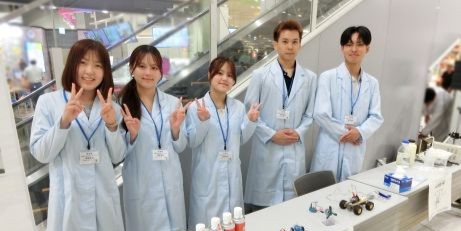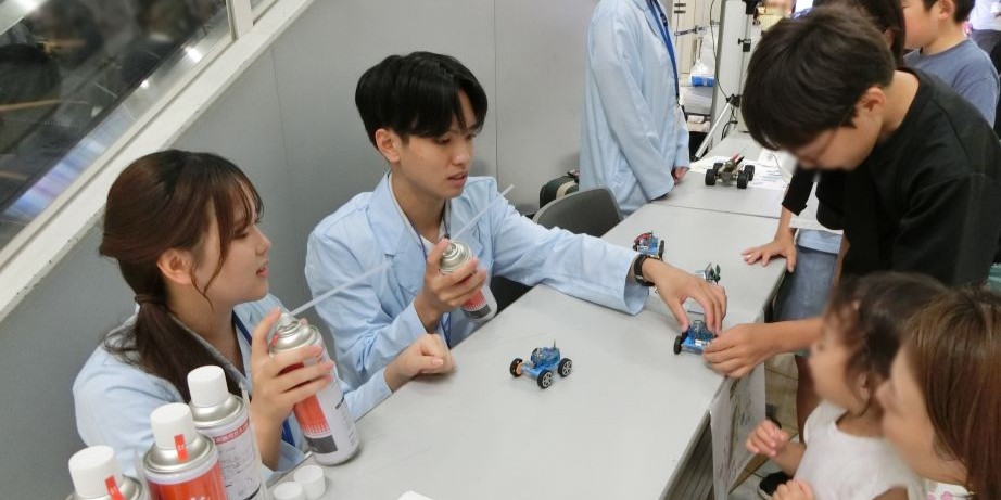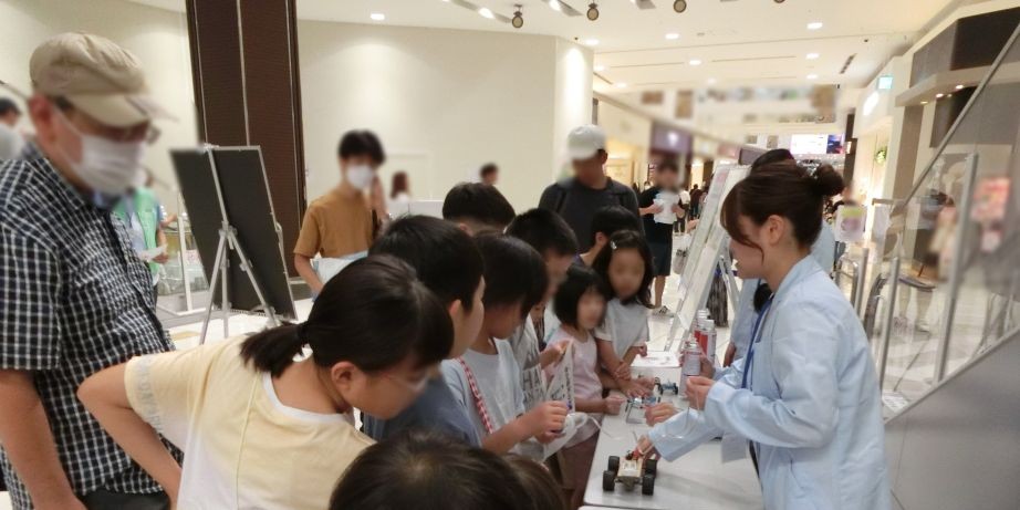 本校学生が「水素エネルギー普及啓発イベント」に応援参加、燃料電池ミニカーを展示 2025年10月1日|お知らせ 奈良県と奈良高専が主催する「水素エネルギー普及啓発イベント」が、令和7年8月30日(土)にイオンモール大和郡山(奈良県大和郡山市)にて開催されました。 このイベントは、小学生以上を対象とした水素や燃料電池に関する基礎講座や展示を行うもので、水素エネルギーで作動する燃料電池を来場者に知ってもらうことを目的としています。公開講座を担当する奈良高専学生5名に加え、本校からは生物応用化学科2年生5名(井澗佑志郎さん、宇野圭音さん、武田颯希さん、玉出実咲さん、辻浦芹夏さん)が応援参加し、燃料電池の説明および燃料電池を搭載したミニカーのデモを行いました。公開講座で基礎実験を体験した小学生の多くが会場に残って燃料電池ミニカーの実演を楽しみ、水素エネルギーについて大いに興味をもってくれたことが伺えました。 本活動は2025年度エネルギー教育支援事業(電気新聞)の助成を受けて実施されました。 担当教職員:生物応用化学科 教授 綱島克彦 燃料電池ミニカーのデモの様子 説明をしている様子 本校からの参加学生