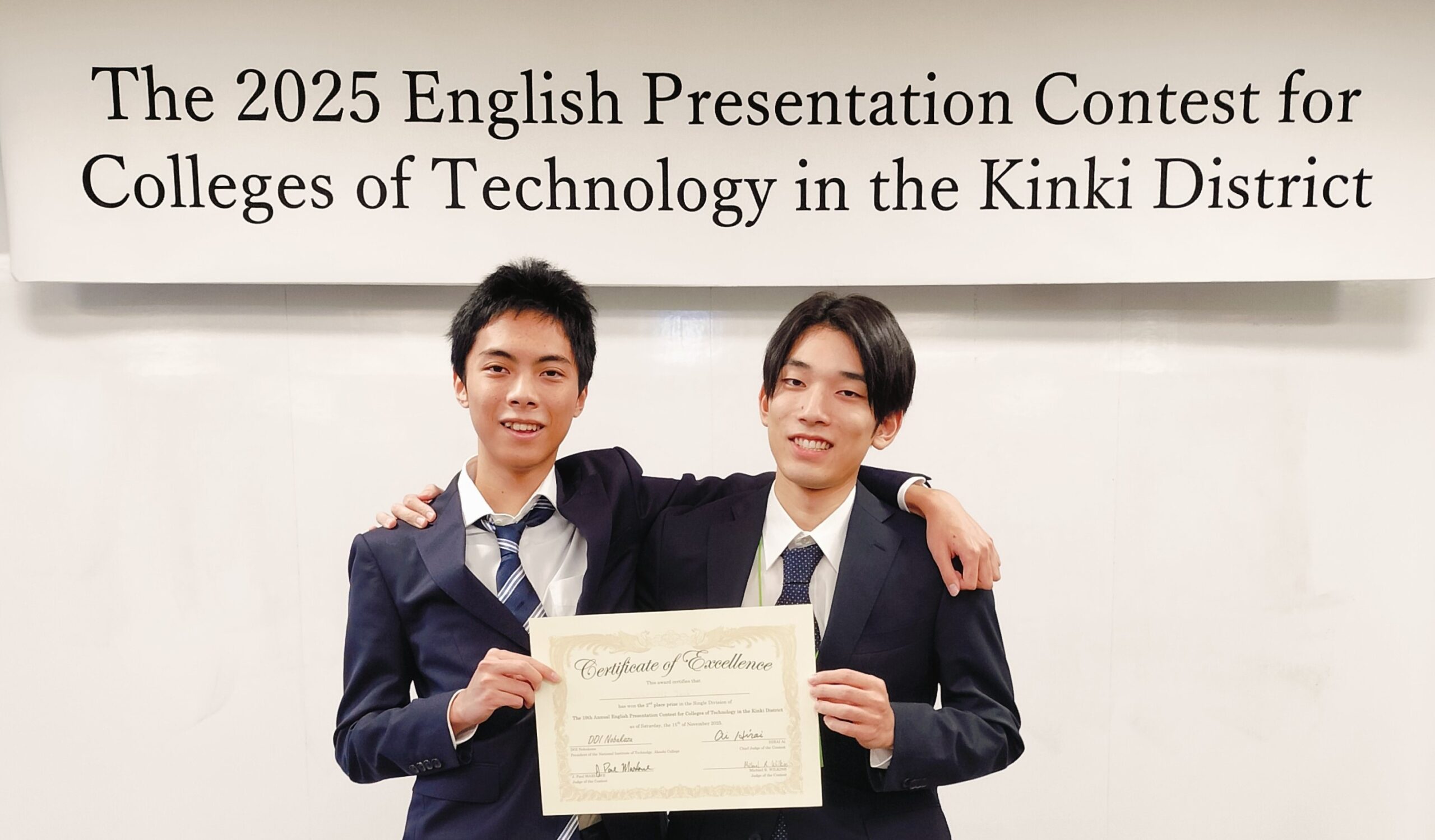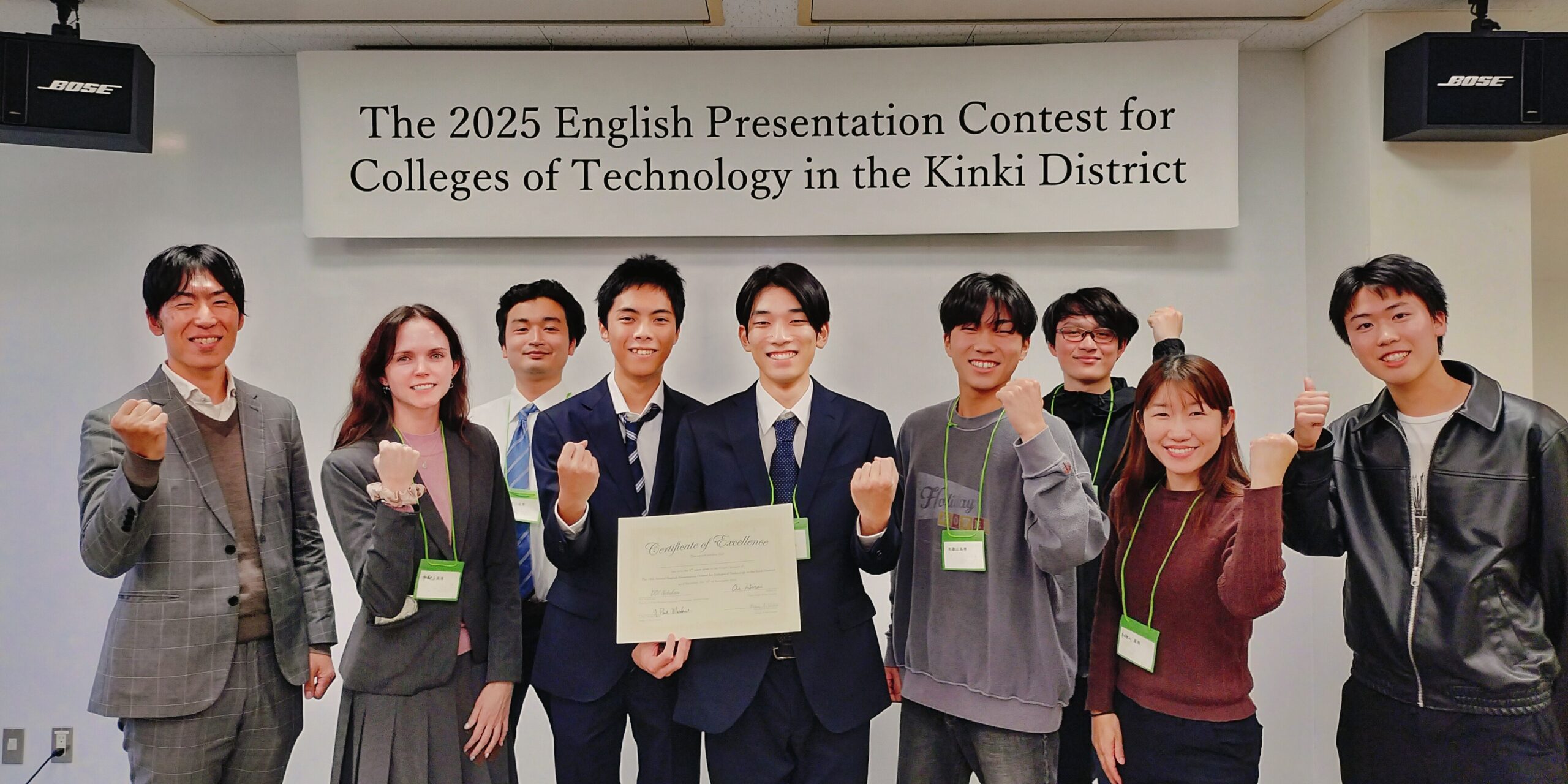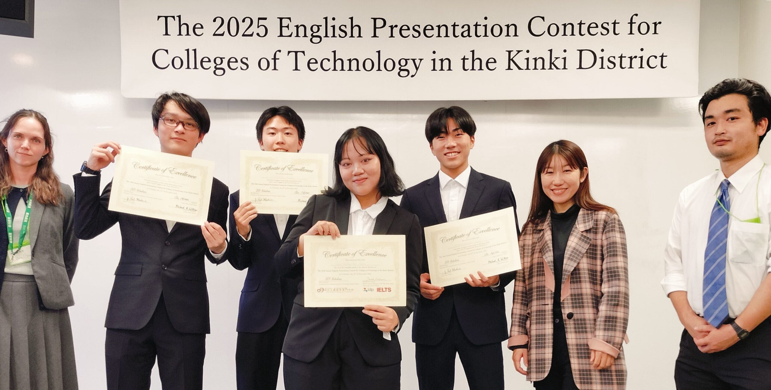 全国高等専門学校英語プレゼンテーションコンテストで入賞 2025年12月2日|お知らせ 11月15日(土)~16日(日)、第19回近畿地区高等専門学校英語プレゼンテーションコンテストが明石高専(明石市)で開催されました。 シングル部門に電気情報工学科5年伊藤諒星さん、坂口勢吹さん、チーム部門に電気情報工学科2年中川空來さん、山吹研蔵さん、山本理雄眞さん、スピーチ部門には、本校の留学生で生物応用化学科のアイヌルさんが出場しました。伊藤さんは紀三井寺競馬場の記憶を残す卒業研究について、坂口さんは大家族の素晴らしさについて、多様なデータを駆使しながらプレゼンを行いました。坂口さんは2位入賞により、全国大会への出場権を獲得しました。チームの3人は将来の農業の崩壊をどう阻止するのかについて、寸劇を取り入れながら問題解決型の発表を行いました。アイヌルさんは「大丈夫?」という言葉がいかに人を救うかというテーマでスピーチし、見事部門1位を獲得しました。 この日のために数ヶ月間準備し、大会直前はほぼ毎日練習した成果を発揮しました。それぞれがベストパフォーマンスを披露できたと思います。 指導教員:総合教育科 准教授 志村 幸紀 総合教育科 准教授 原 めぐみ 総合教育科 助教 岡村 康平 総合教育科 助教 グレイディ クレア